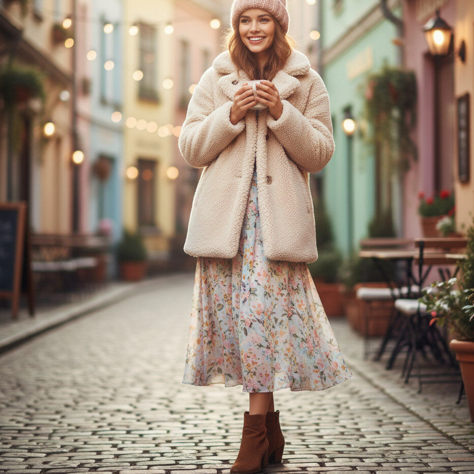 Soft and stylish — wear a teddy coat over a flowy skirt and ankle boots. Add a knitted hat for that soft-girl 겨울 옷 코디 (winter outfit coordination) aesthetic.