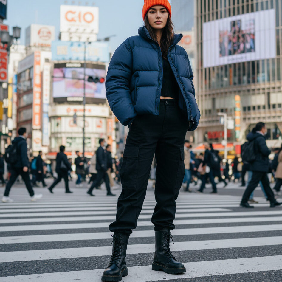 Go for a sporty aesthetic: down puffer, black cargo pants, and combat boots. Finish with a beanie — the ultimate Korea winter outfit meets Shibuya-ready streetwear look.