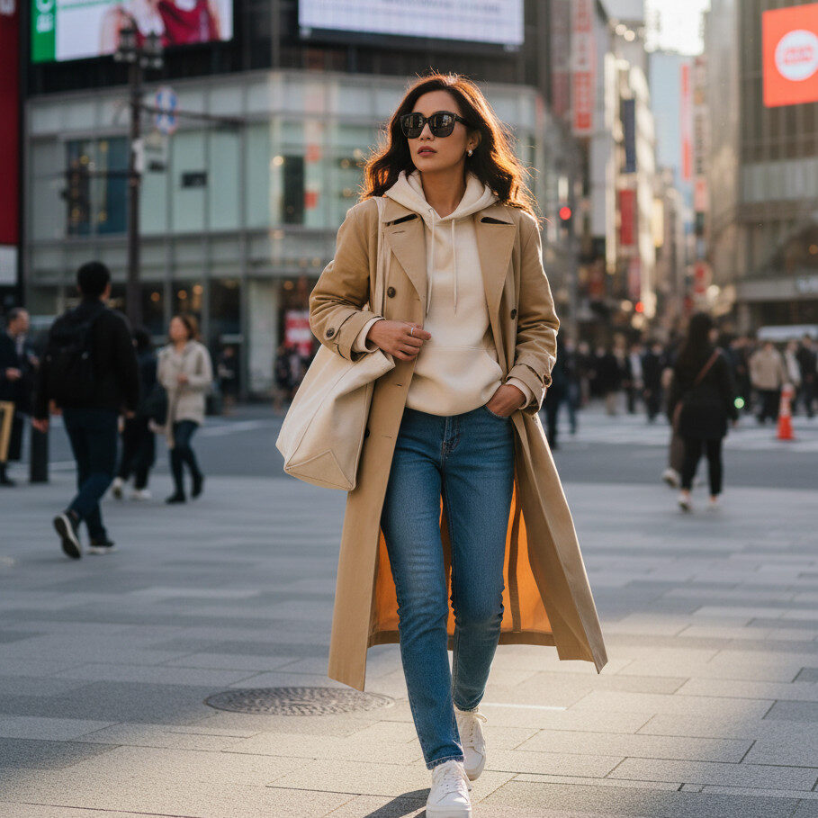 Blend comfort and cool: layer a neutral trench over a hoodie, jeans, and sneakers. Add sunglasses and a tote — perfect Japan winter fashion for travel days.