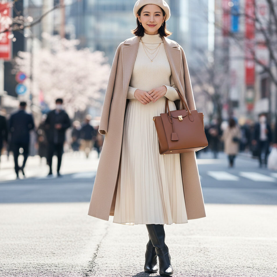 Start with a long beige wool coat, cream turtleneck, pleated midi skirt, and knee-high boots. Add a beret and structured tote for a polished Japan winter fashion aesthetic. Perfect for city strolls in Tokyo.