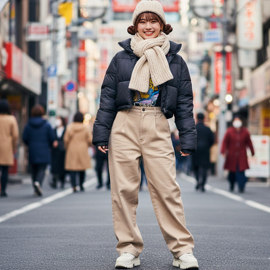 Pair a cropped black puffer with beige wide-leg pants and a chunky knit scarf. Finish with platform sneakers for a comfortable yet cool Japan ootd winter fit inspired by Harajuku streetwear.