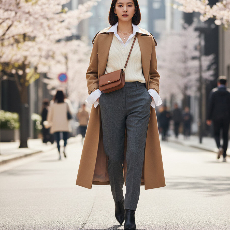 Layer a knit vest over a shirt and pair with straight pants and heeled boots. Throw on a trench for a balanced Korea winter fashion x Japan outfit winter fusion.