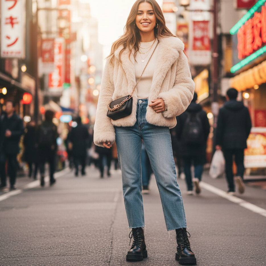 Style a cream faux fur jacket with straight jeans, a ribbed top, and chunky boots. Add a mini bag for that trendy Tokyo outfits winter street-style flair.