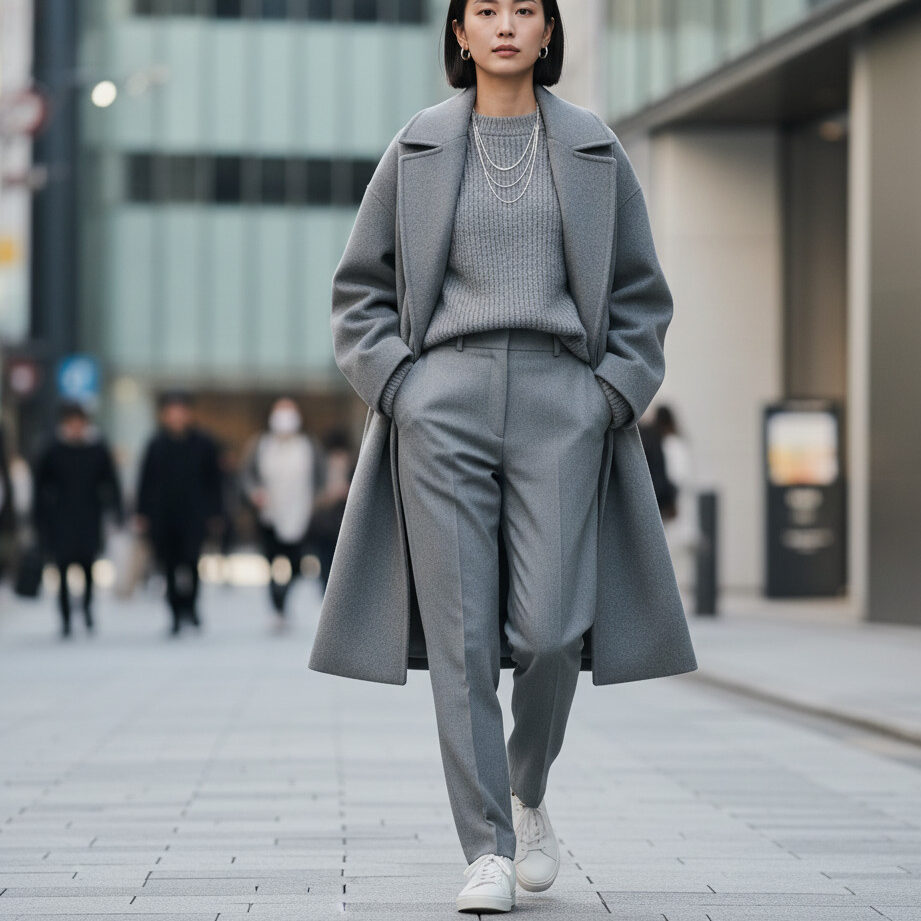 Wear a gray oversized sweater, matching wool coat, and tailored trousers. Accessorize with silver jewelry and sneakers — minimalist yet elegant Japan December outfit energy.
