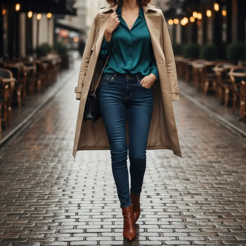 Balance casual and luxe with a satin blouse tucked into dark skinny jeans. Style with heeled booties and a tailored trench. Ideal for fall night out outfits or chic winter evenings.