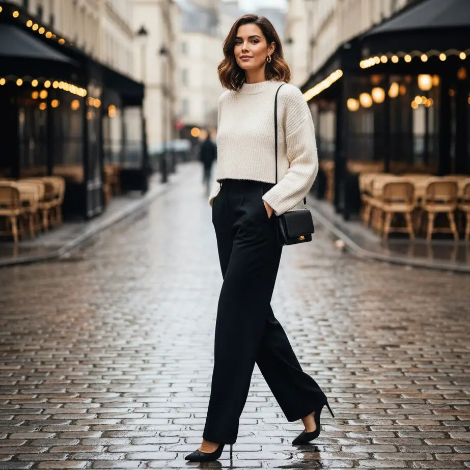 Opt for balance—pair a cropped knit sweater with wide-leg trousers. Add sneakers for casual, or heels for elevated vibes. Works as a winter bar outfit or casual winter birthday outfit.