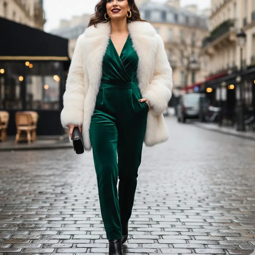 Go bold with a velvet jumpsuit in deep jewel tones. Top with a faux fur statement coat, stiletto boots, and gold hoops. This elevates date night looks while keeping you warm.